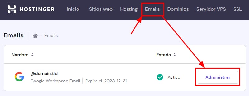 Puedes renovar tu plan de correo electrónico de Google Workspace en cualquier momento. Solo debes abrir la sección de Emails y seleccionar Administrar: