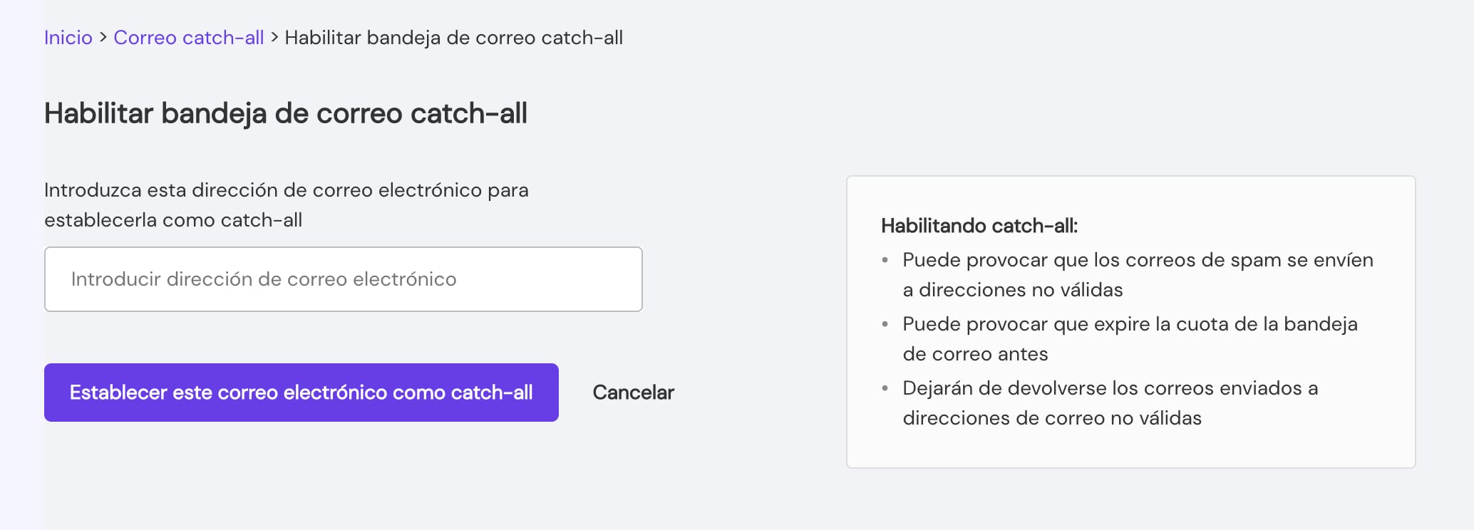 Todo lo que tendrás que hacer es especificar la dirección de email que quieres establecer como catch-all y hacer clic en Establecer este email como catch-all.