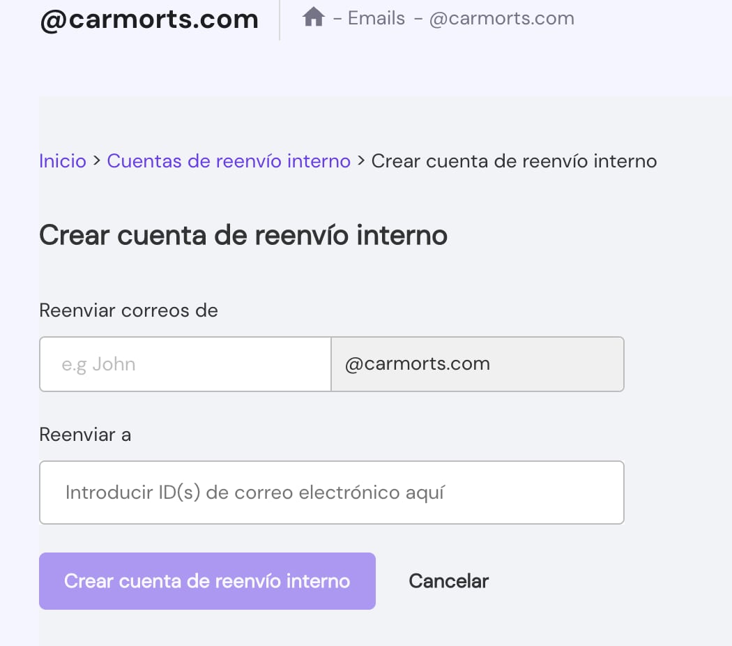 Y al seleccionar Crear una cuenta de reenvío interno: