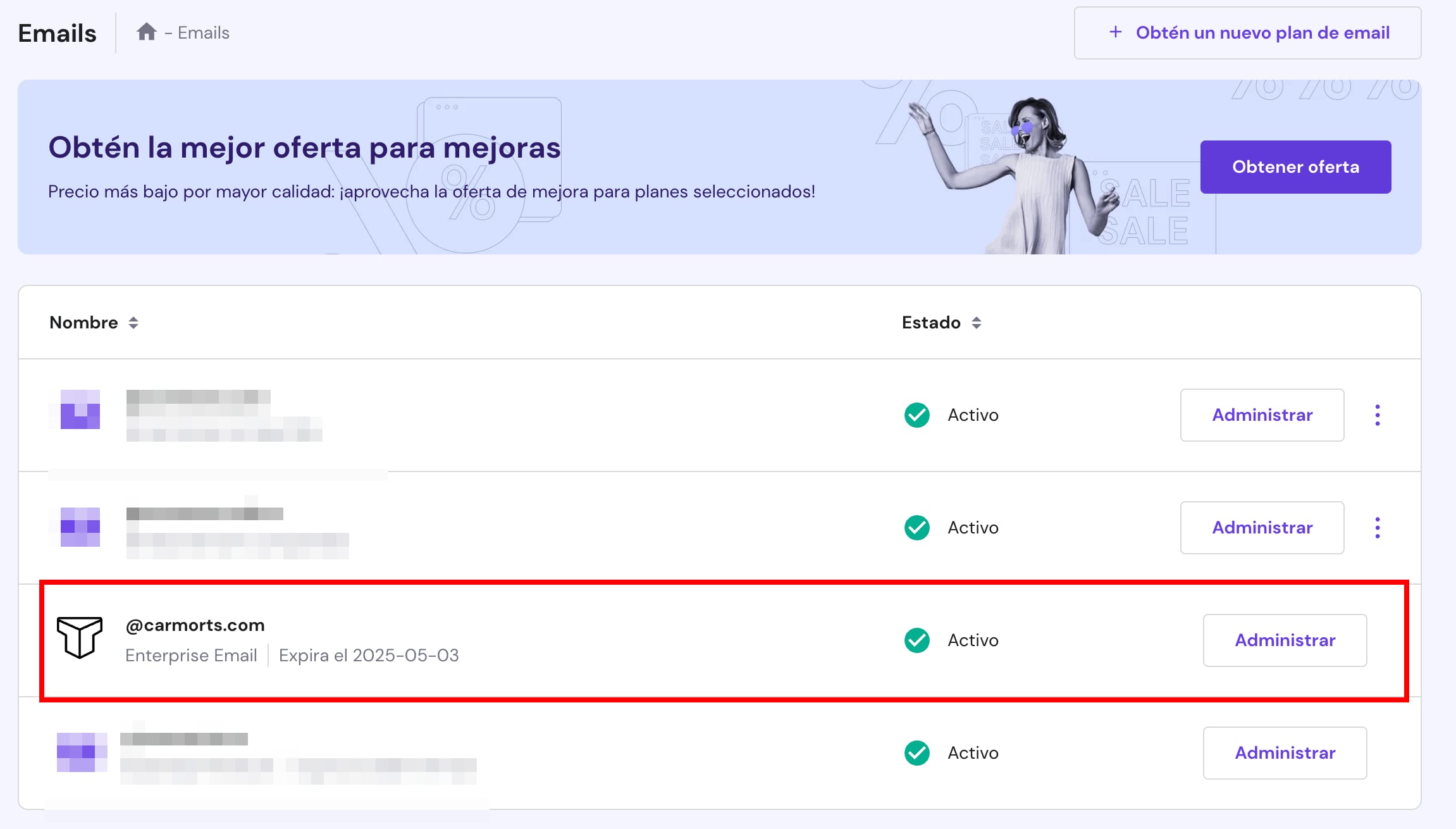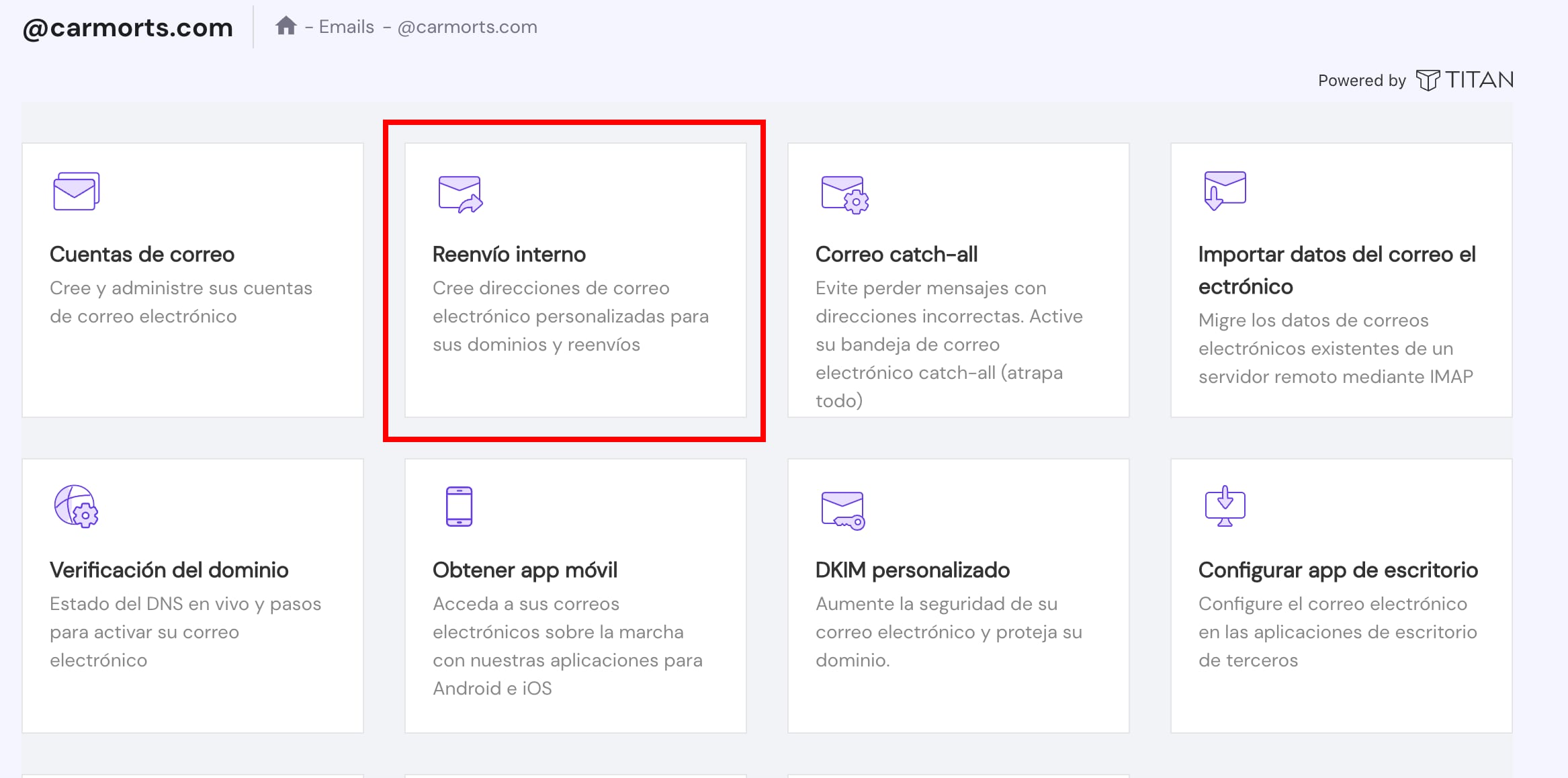Los reenviadores internos son una excelente manera de reenviar emails desde una dirección de email particular a otro buzón de email existente. Con Titan Email puedes crearlos al abrir la sección Emails y seleccionar tu dominio: