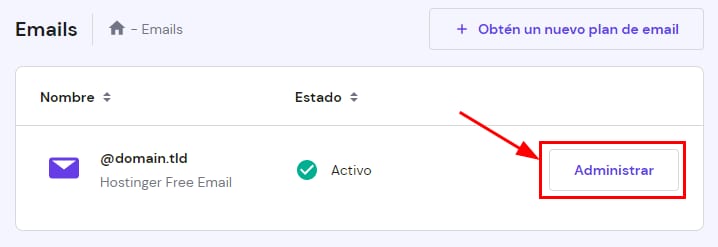 En caso de que aún no tengas un plan de hosting, o solo necesites el servicio de correo, puedes comprar de email solamente. Para realizarlo, ve a la sección Emails y selecciona Obtén un nuevo plan de email: