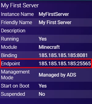 Cuando se complete la descarga, haz clic en el botón Iniciar (Start) nuevamente. El servidor se iniciará y podrás conectarte a él utilizando la información de Endpoint: