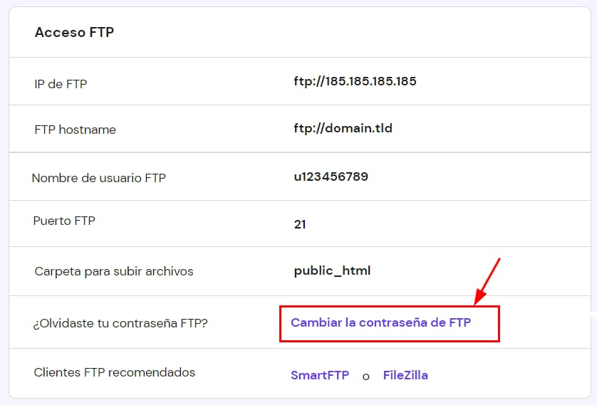 Allí, podrás actualizar tu contraseña de FTP haciendo clic en Cambiar contraseña de FTP: