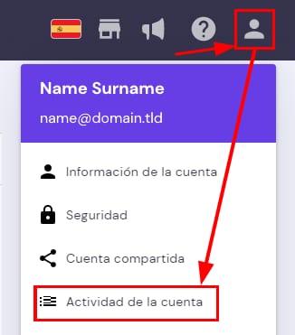 Si deseas revisar quién ha ingresado a tu cuenta Hostinger, ¡tenemos una herramienta justo para ello! Da clic en el icono de perfil y elige Actividad de la cuenta:
