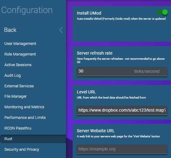 Una vez hecho esto, dirígete a configuration > Rust Page. Allí encontrarás todas las configuraciones para su servidor Rust. Allí, busca un campo URL de nivel. En este campo, debes insertar un enlace de descarga directa que tu servidor utilizará para descargar el mapa:
