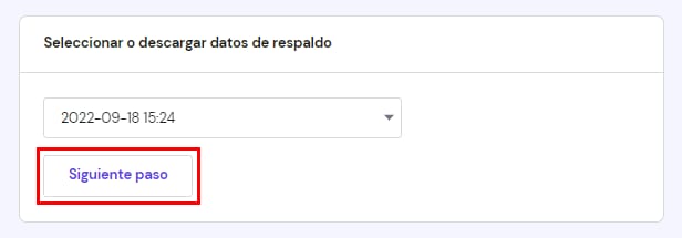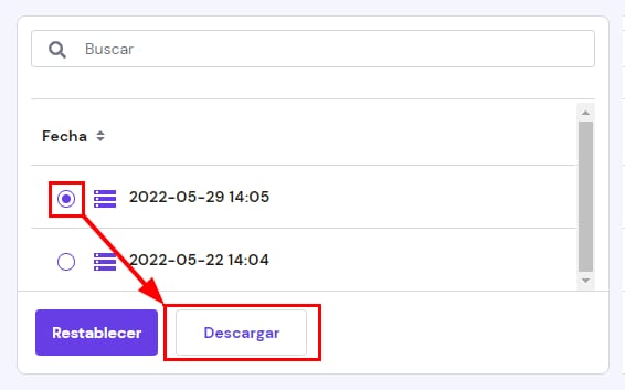 Se aplica un proceso similar al descargar bases de datos generadas. Da clic en Copias de seguridad de bases de datos, elige la base de datos de la lista y la fecha, luego da clic en Descargar: