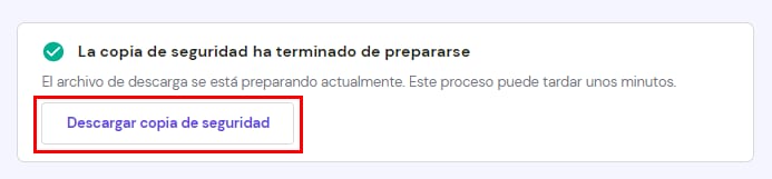 Espera unos minutos y el enlace de descarga estará listo, solo da clic en Descargar copia de seguridad: