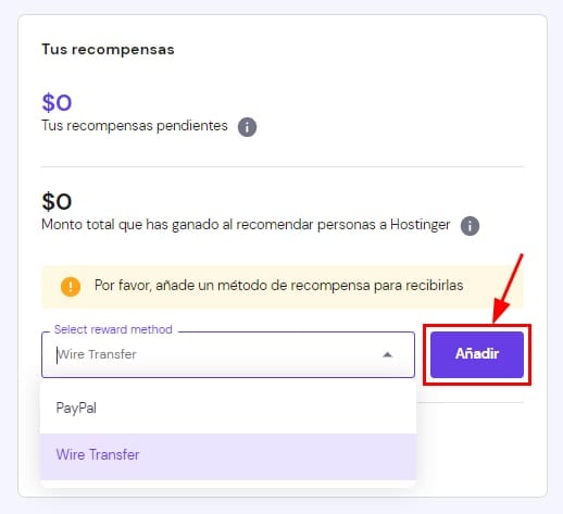 Antes de recibir tus recompensas, deberás agregar un método de pago. Las opciones disponibles son Paypal y transferencia bancaria. Ve a la sección Referidos, selecciona tu opción preferida de la lista desplegable y da clic en Añadir :