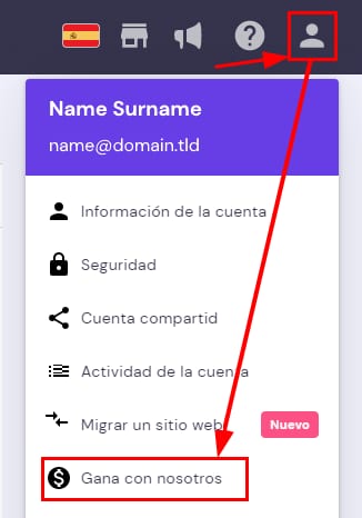 Accede a la sección de referencias en hPanel haciendo clic en tu avatar y seleccionando Gana con nosotros: