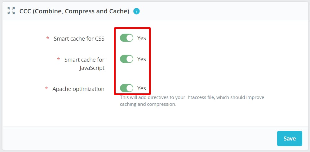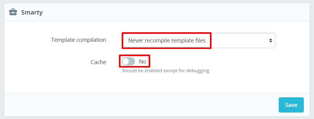 Navega a la pestaña Parámetros avanzados → Rendimiento en tu Área de administración de Prestashop y verifica esta configuración, dejando los valores actuales en cualquier otra sección. Recuerda guardar los cambios: