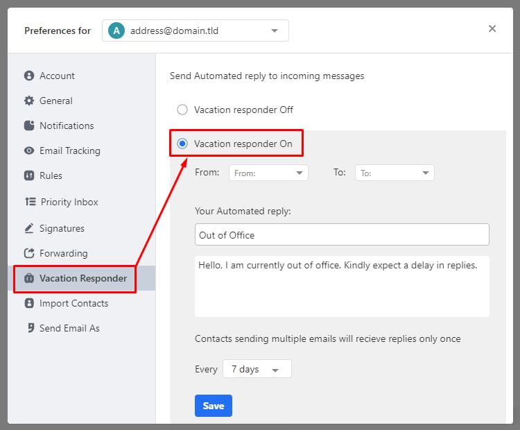 Una vez que hayas agregado toda la información, haz clic en Guardar y ¡listo! Todos los mensajes enviados a esa dirección de email recibirán la respuesta automática programada.