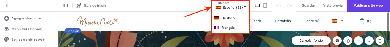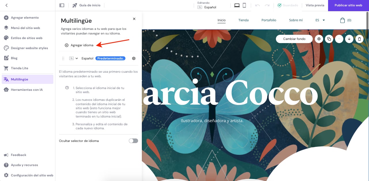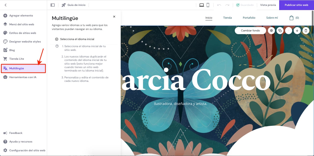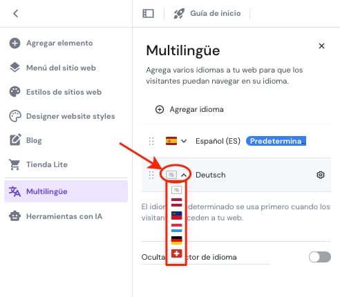 1. Dentro del creador de webs, expande el panel Multilingüe a la izquierda:
