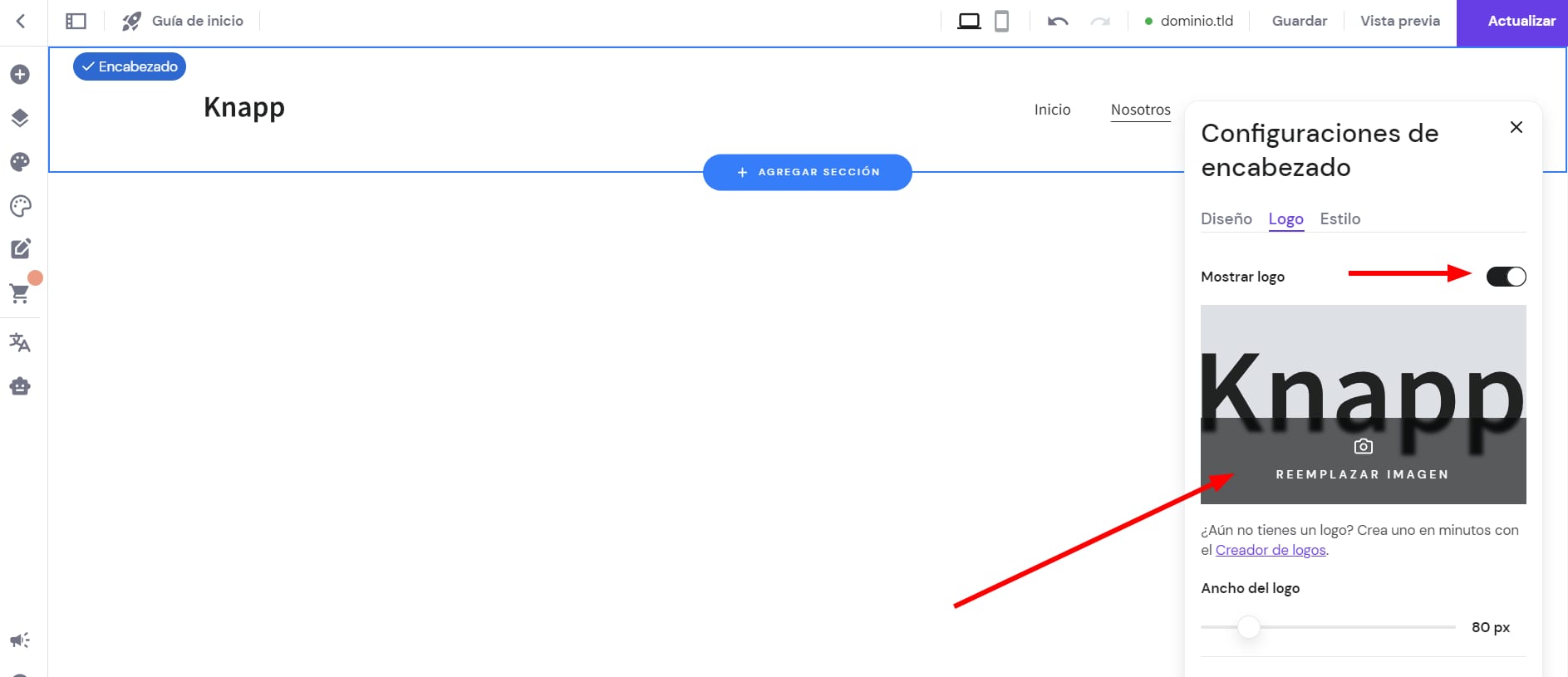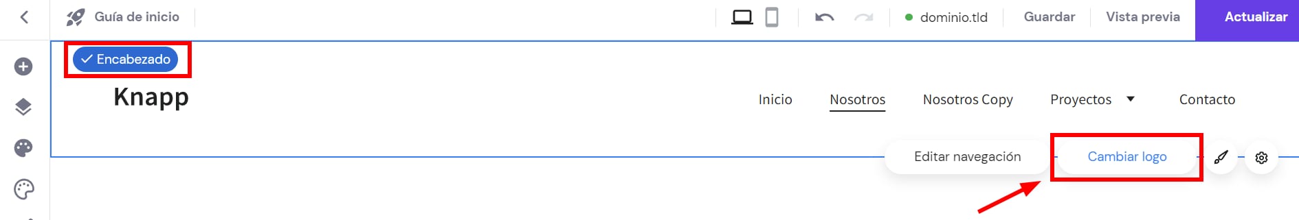 1. Dentro del editor del sitio web, haz clic en la sección del encabezado y selecciona Cambiar logo: