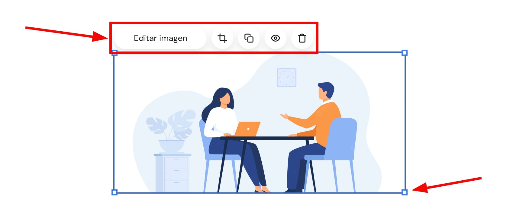 Haz click en el elemento para ver más opciones (editar imagen, recortar, pegar, duplicar y eliminar):