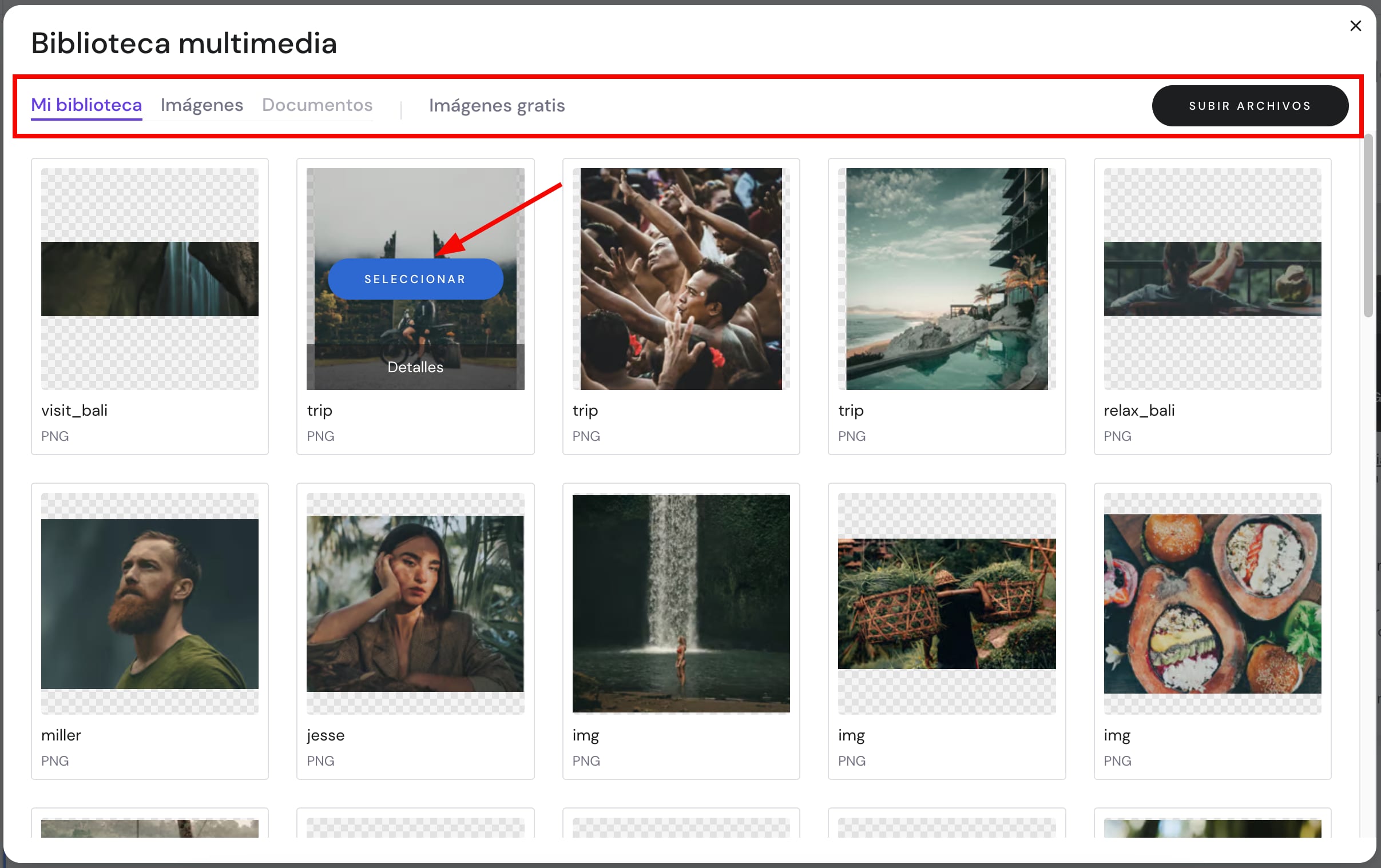 Puedes agregar tu propia imagen haciendo click en Editar Imagen → Subir Archivos, selecciona un archivo de tu biblioteca, navega entre las imágenes disponibles o bien sube tu propia imagen: