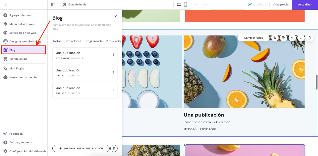 Puedes administrar las publicaciones de tu blog y sus categorías a través del panel de administración de blog a la izquierda: