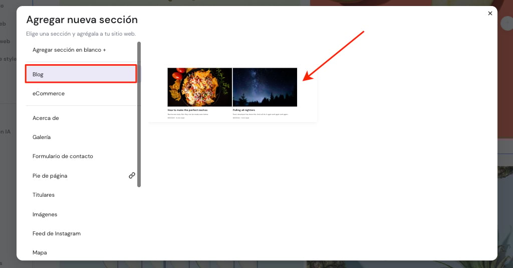Desde el menú de las secciones, selecciona Blog y haz clic en su miniatura. Al hacerlo, se insertará una sección de blog en medio de las dos secciones (donde has hecho clic para añadir la sección):