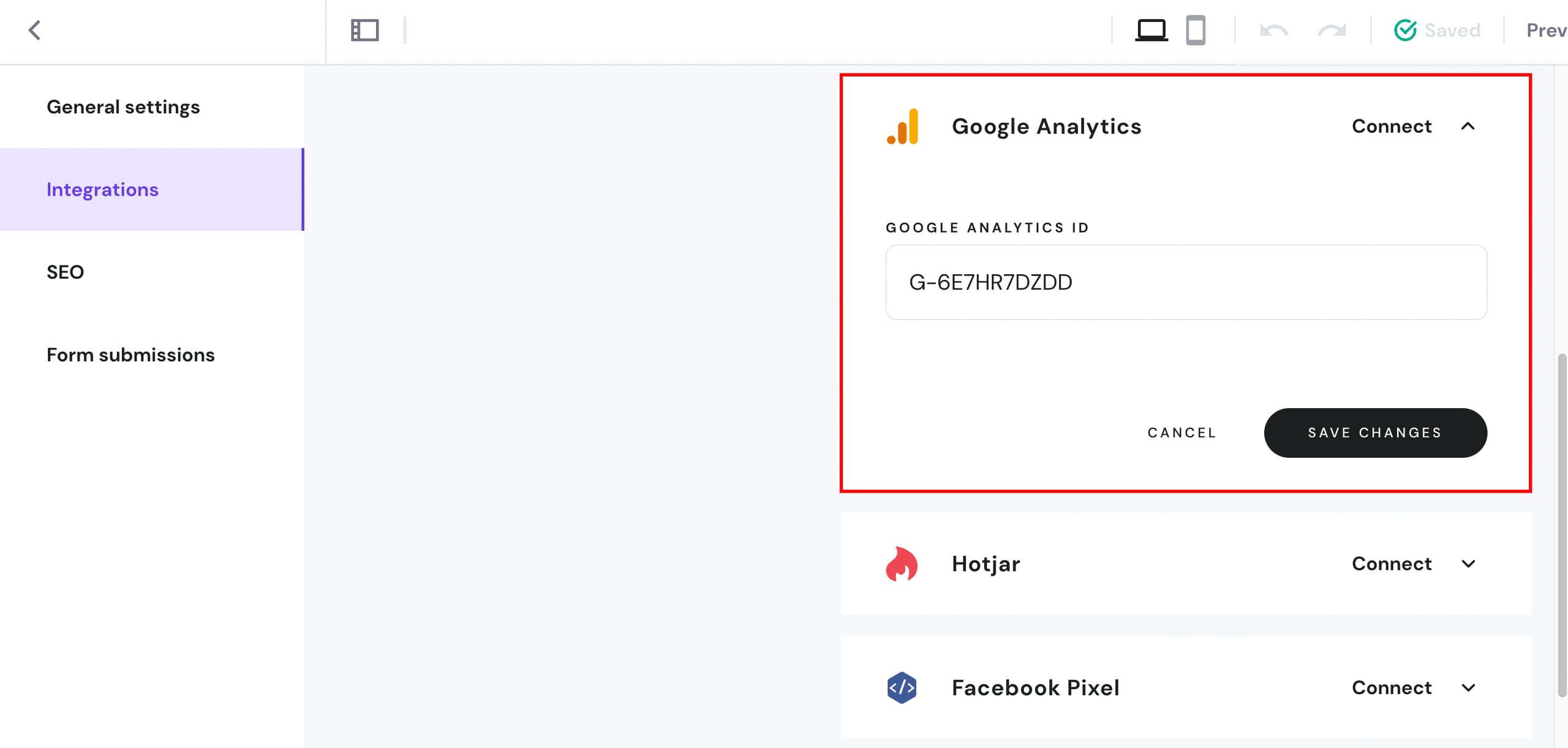Dentro del editor, abre la configuración de integraciones de tu sitio web, busca el campo Google Analytics e inserta tu ID de medición allí: