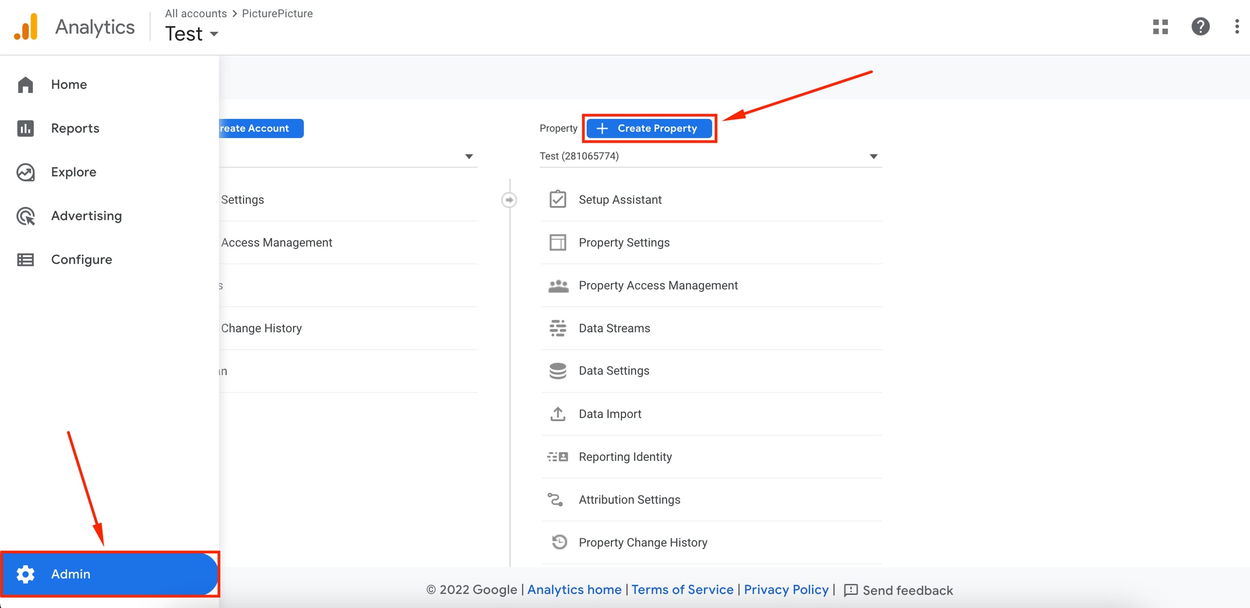1. En tu cuenta de Google Analytics, abre la sección Administrador en la parte inferior izquierda y haz clic en Crear propiedad: