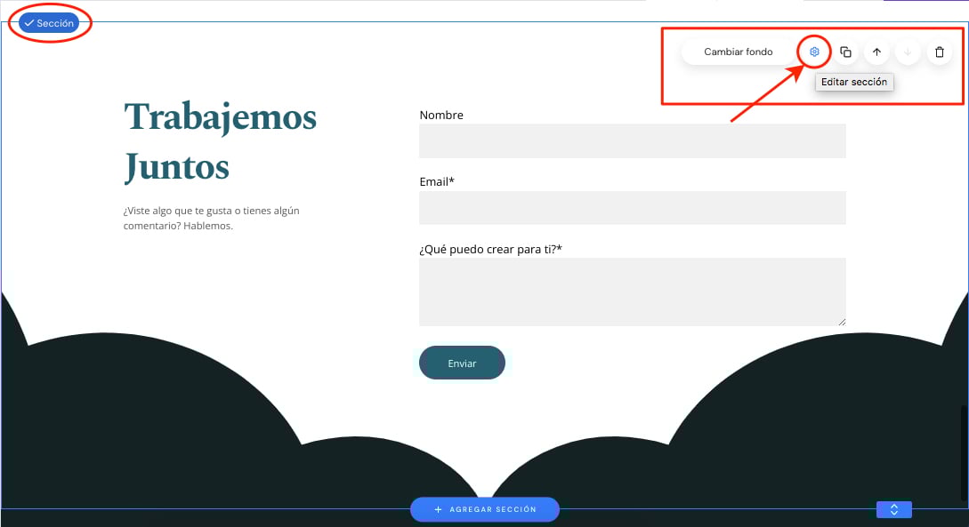 2. Pasa el ratón por cualquier parte de la sección para que aparezca la barra del menú de la misma. Haz clic en la rueda dentada para abrir las configuraciones de sección: