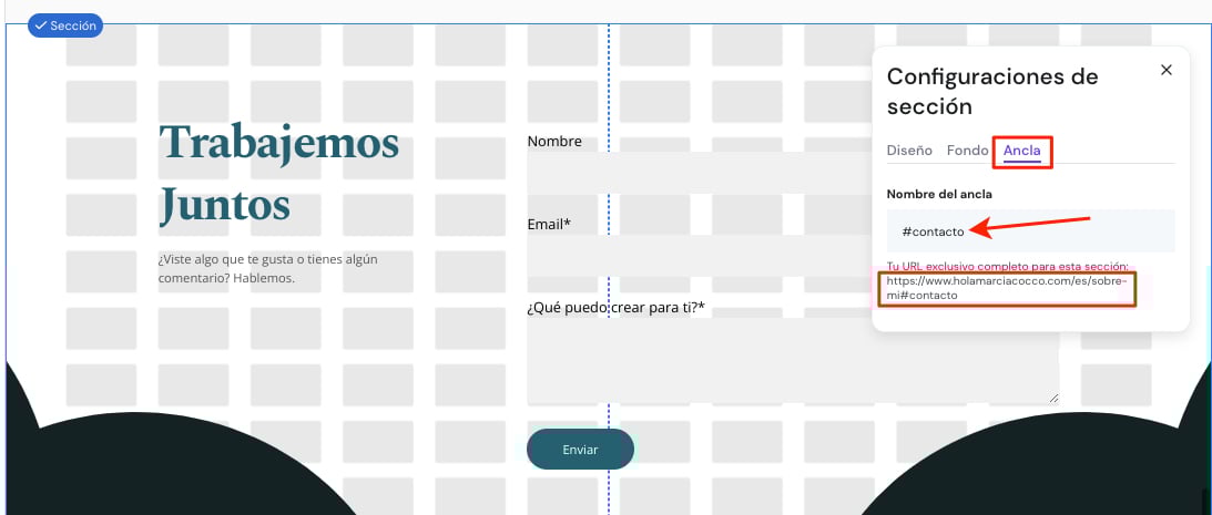 3. En la pestaña Ancla, crea el Nombre del ancla. Debe empezar con la almohadilla (#), por ejemplo, #contacto. Es como el título de la sección y será parte de la URL: