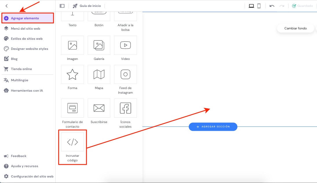 El elemento de incrustar código te permite insertar un código personalizado en la parte <body></body> del código de tu web.