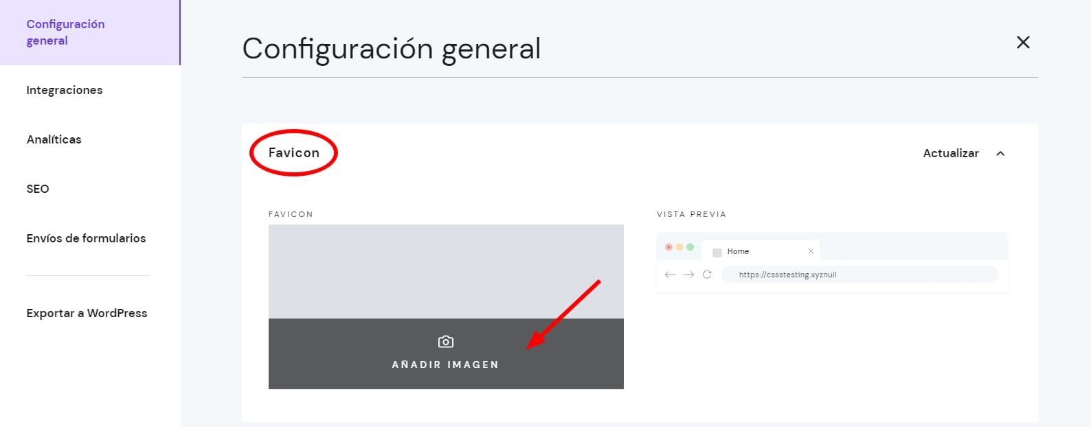 Dentro del Creador de sitios de Hostinger, accede a la configuración general del sitio web. Expande la sección Favicon, haz clic en Agregar imagen y carga tu archivo: