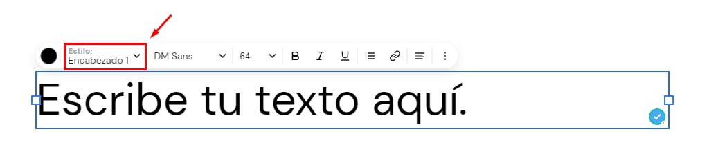 Todos los elementos de texto de tu sitio web se clasifican como encabezados (títulos y subtítulos), párrafos (descripciones) o elementos de navegación (enlaces). Si no estás seguro del estilo de un elemento de texto en particular, haz clic en él y selecciona Editar texto; verás el estilo de texto actual en la barra de herramientas: