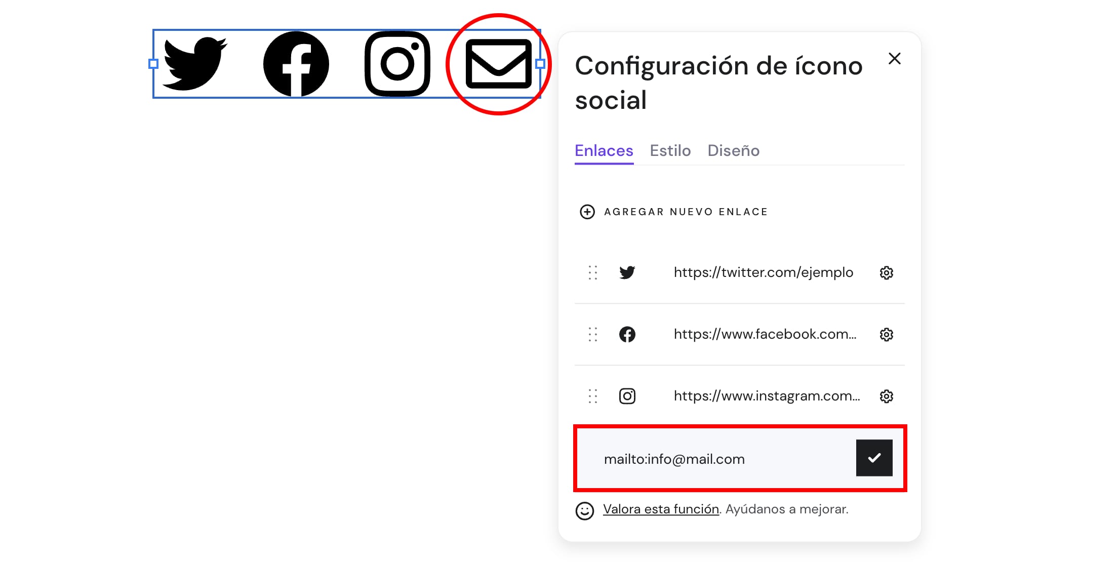 Para agregar un ícono de correo solo agrega tu dirección de correo electrónico: