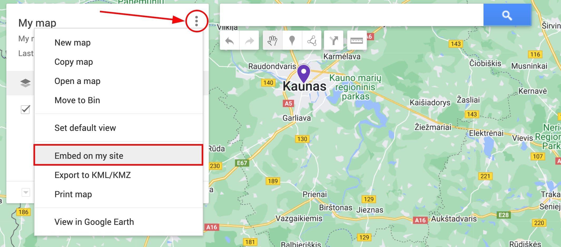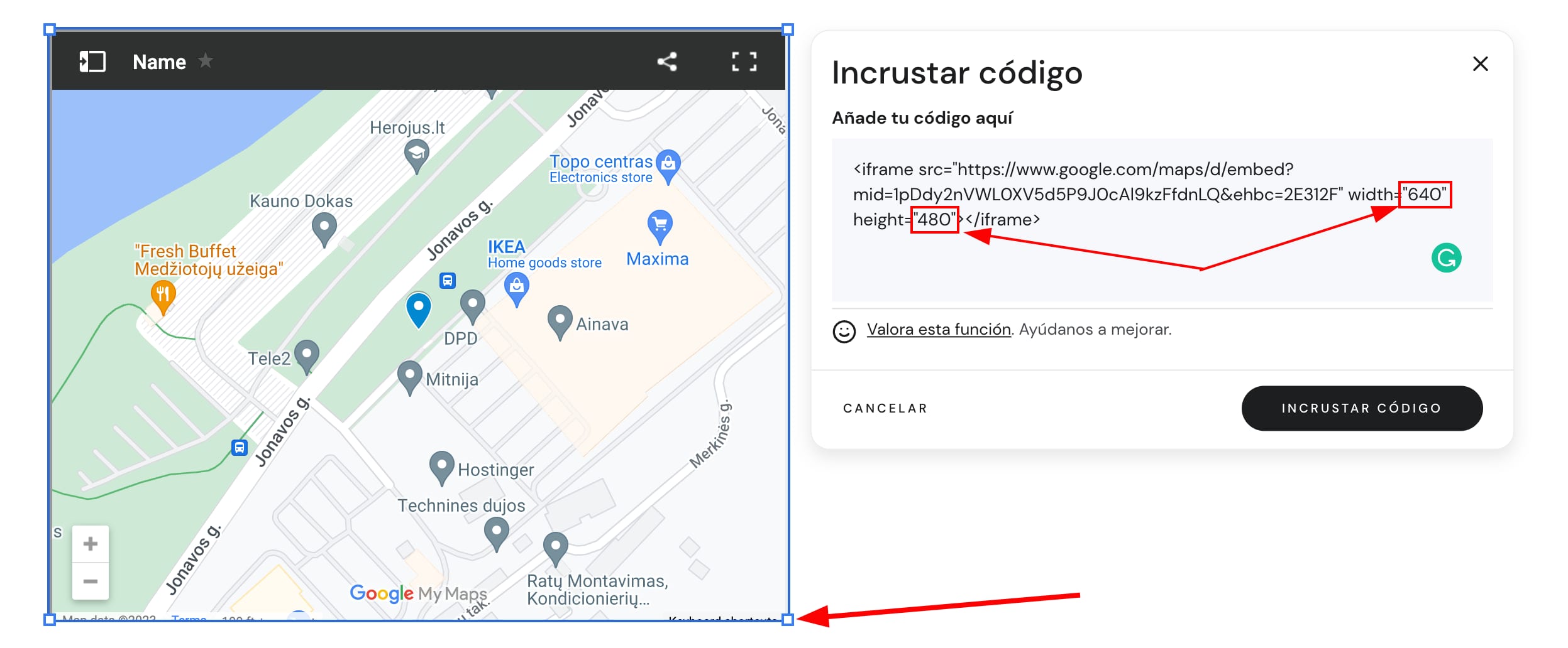 Obtendrás el código de tu mapa. Cópialo y pégualo en tu sitio utilizando elelemento incrustar código. Si deseas que el mapa sea más grande o más pequeño, cambia el tamaño del elemento de código o cambia los números de ancho y alto en el código dentro del elemento: