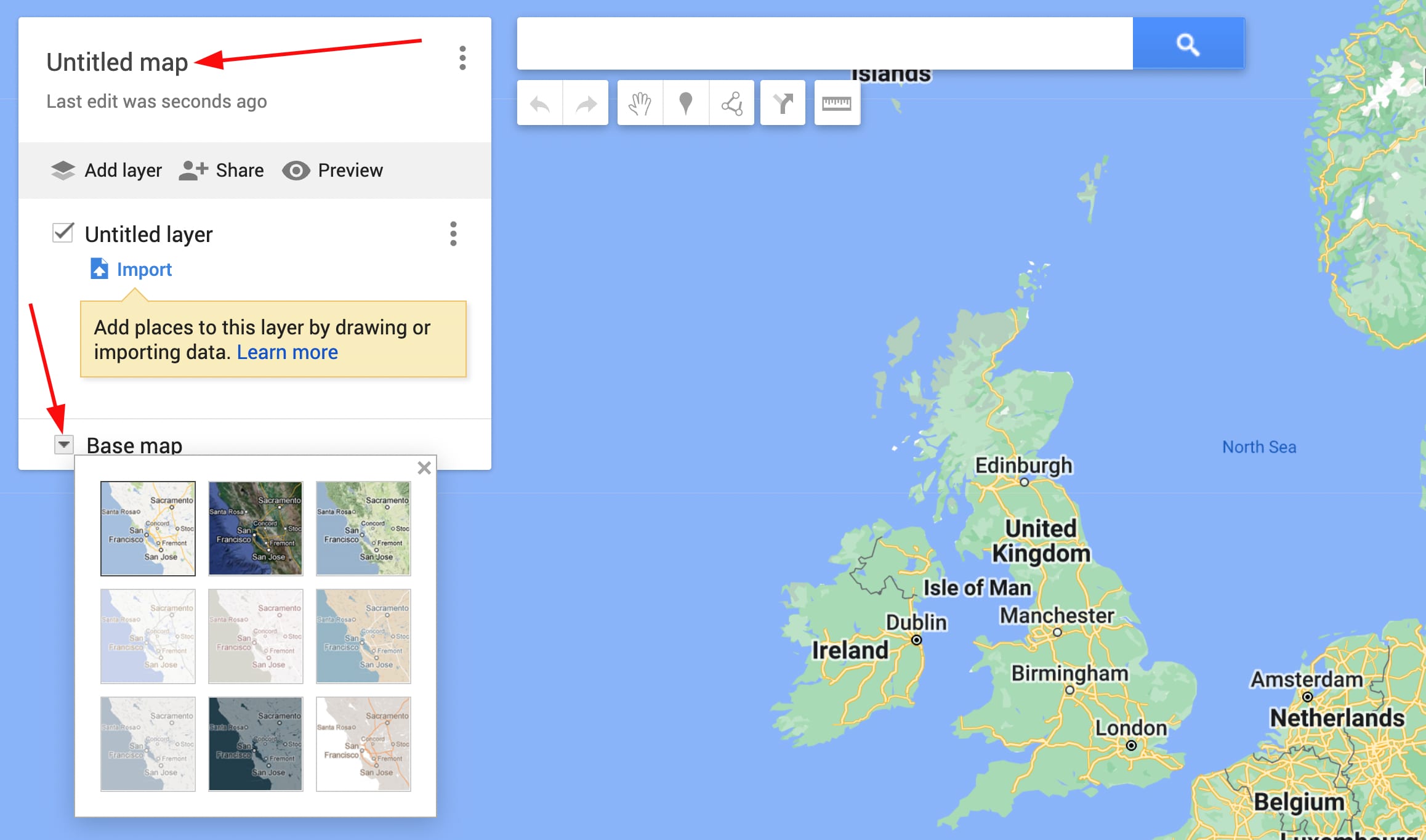 Abre Google My Maps y da clic en Crear un nuevo mapa. Da clic en Mapa sin título para agregar el nombre y la descripción de tu mapa. También puedes elegir la apariencia del mapa haciendo clic en Mapa base: