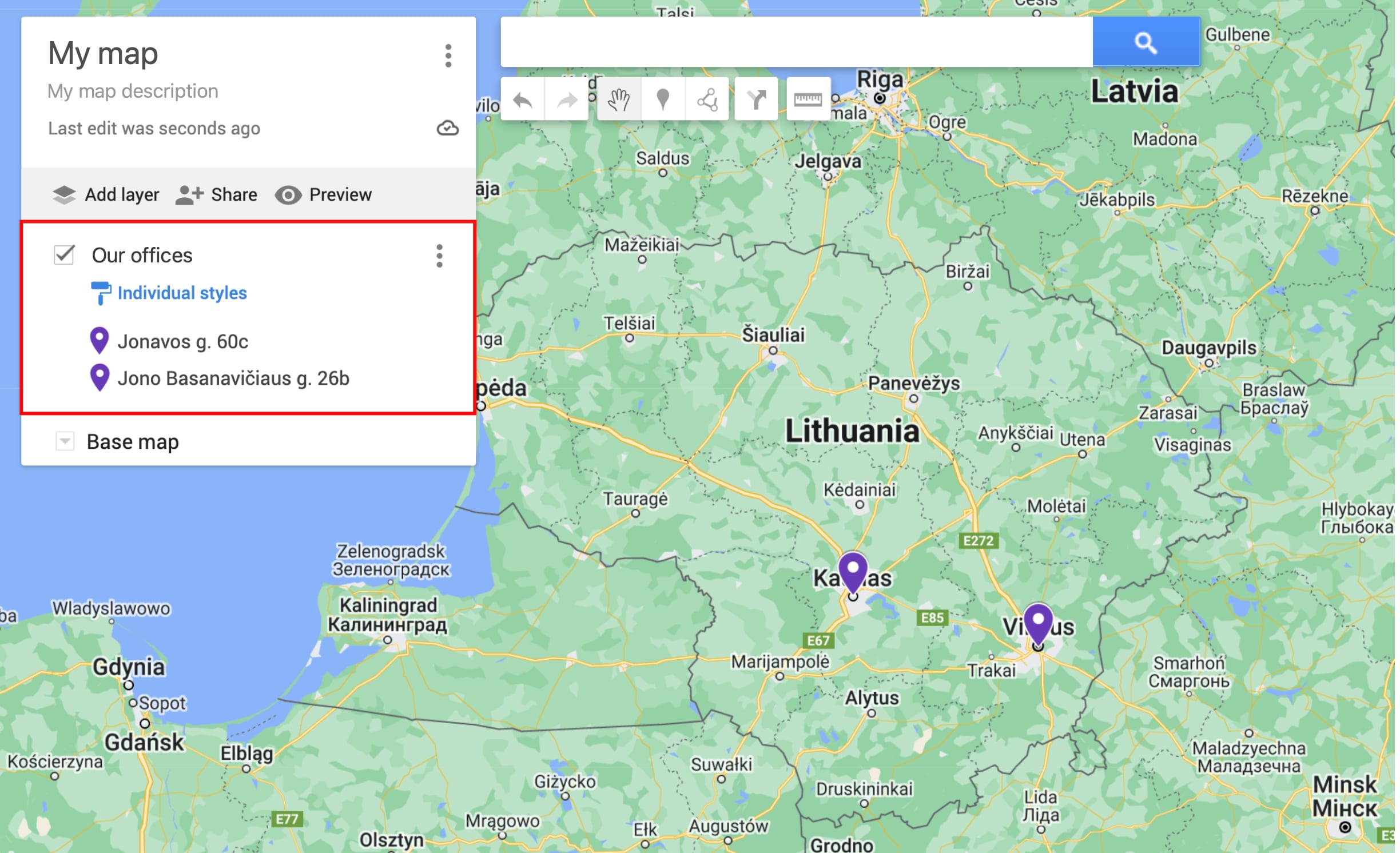 Si tienes varias ubicaciones y deseas marcarlas todas en el mapa, puedes hacerlo con My Maps de Google.