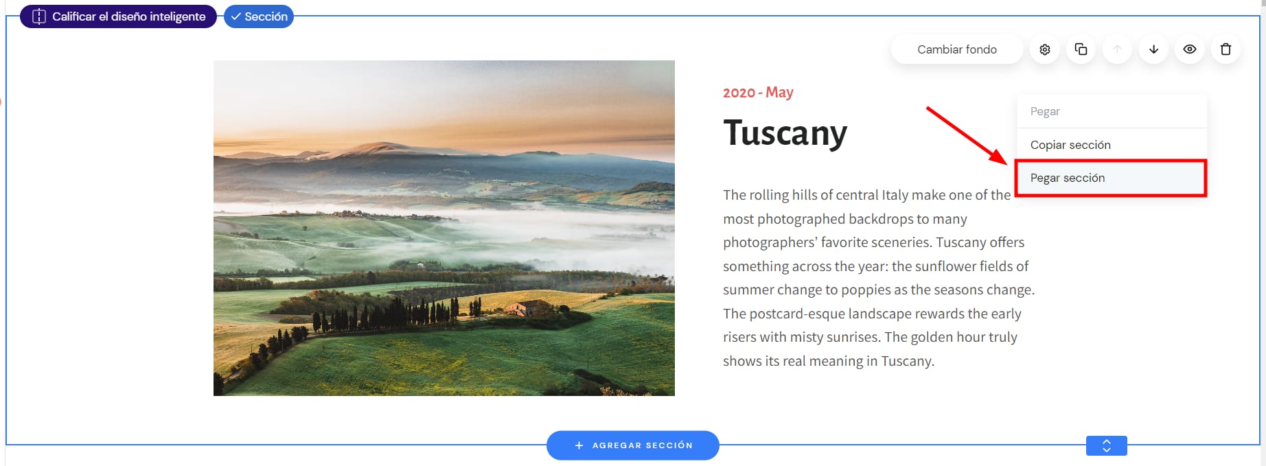 Para pegar una sección, haz clic derecho en un espacio vacío de una sección y selecciona Pegar sección: