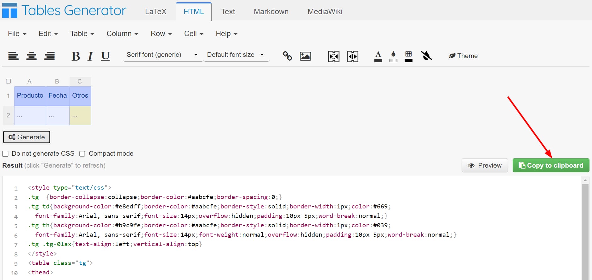 Puedes crear tablas utilizando generadores de tablas en línea gratuitos e insertarlas en tu web. En este ejemplo, se utiliza la herramienta Generador de tablas. Sigue los pasos a continuación para crear una tabla simple y añadirla en tu web 👇