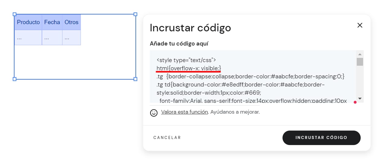 NOTA: Para que la tabla sea desplazable, agrega html{ overflow-x: visible; } al comienzo de tu código, después de <style type="text/css">