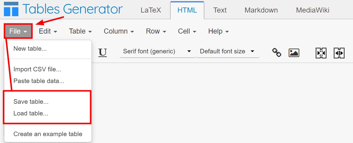 Puedes guardar los datos de tu tabla para editarlos en el futuro usando el botón Guardar tabla… Podrás volver a cargar tu tabla guardada en esta herramienta usando el botón Cargar tabla… y realizar cambios en la tabla más tarde: