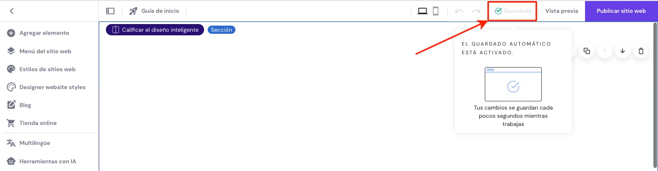 Mientras editas tu sitio web, el creador de webs guarda tus cambios de manera automática. Puedes comprobar su estado en la barra del menú superior del editor: