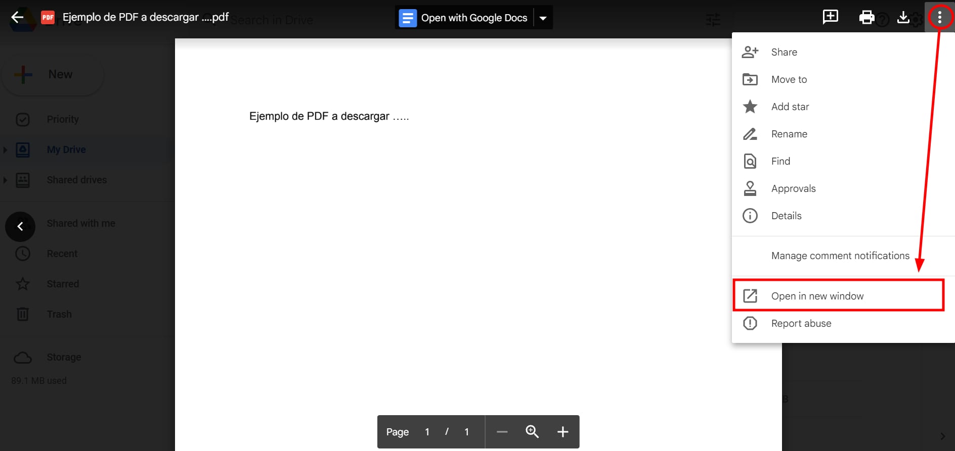2. Abre el archivo PDF en Google Drive, haz clic en el botón de puntos suspensivos ⋮ en la parte superior derecha y selecciona Abrir en una ventana nueva: