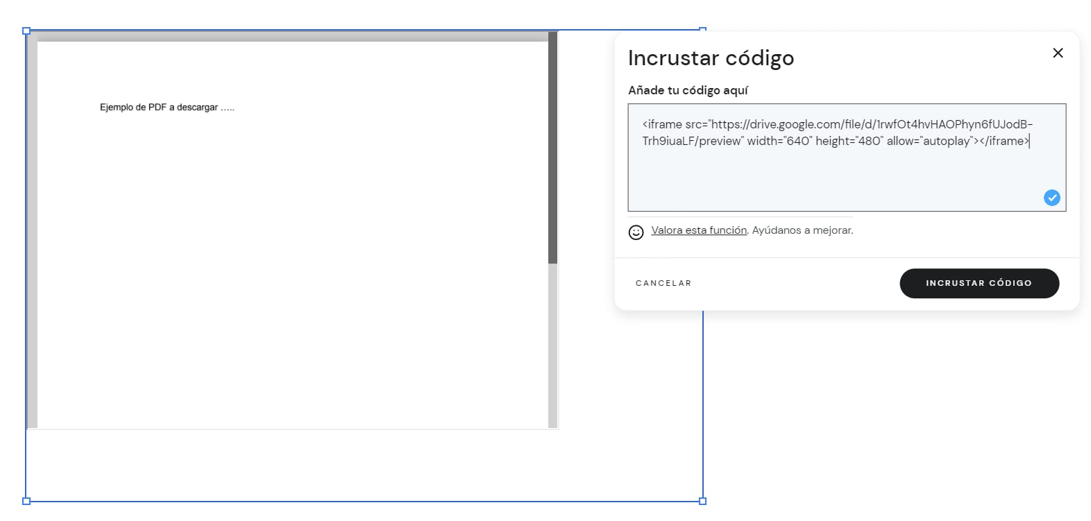 Al incrustar el archivo PDF: agrega un documento a través de un código personalizado para mostrarlo en tu web como se describe a continuación.