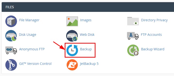 Ve a tu sección cPanel → Archivos y haz clic en Copia de seguridad:
