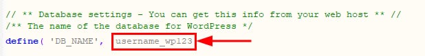 Siguiendo el ejemplo de WordPress, puedes identificar qué base de datos corresponde a cada uno de tus sitios web abriendo el archivo wp-config.php del sitio web mediante una aplicación de bloc de notas. El nombre de la base de datos aparecerá junto al parámetro DB_NAME: