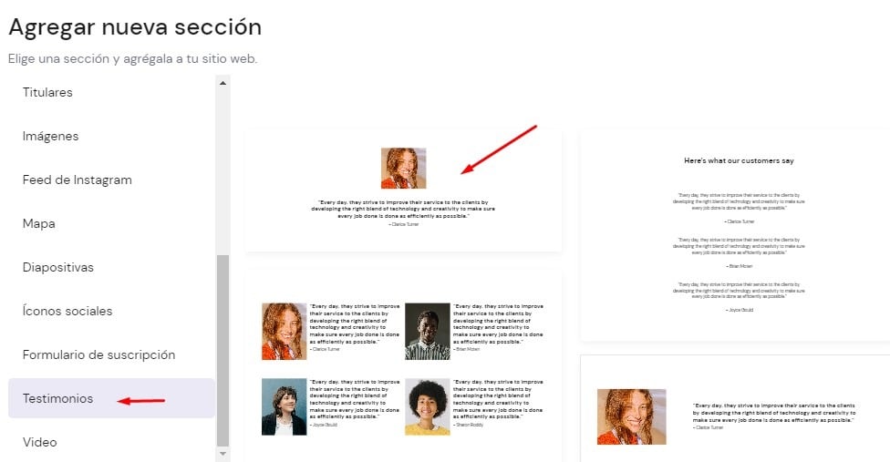 En el menú de secciones a la izquierda, selecciona Testimonios y, a la derecha, selecciona la plantilla de sección preferida. Haz clic en él y se insertará en tu página: