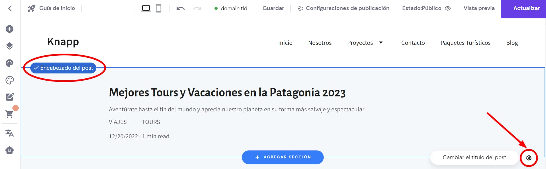 Para abrir la configuración del encabezado, haz clic en la sección del encabezado de la publicación y luego haz clic en el icono de la rueda de configuración: