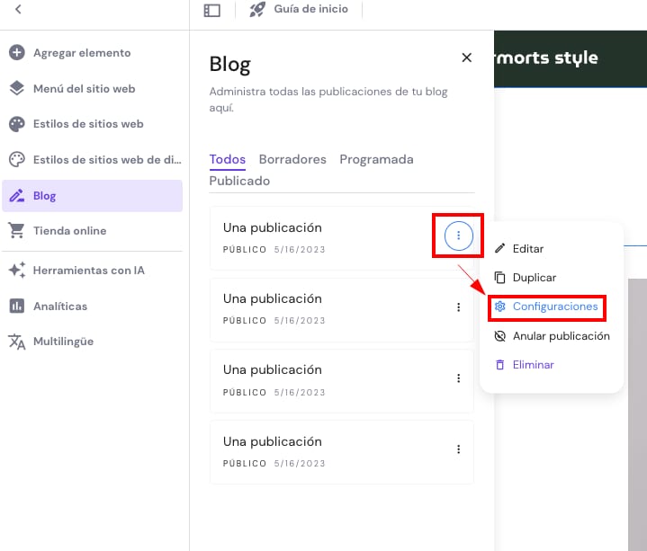 Abre la configuración de la publicación del blog: