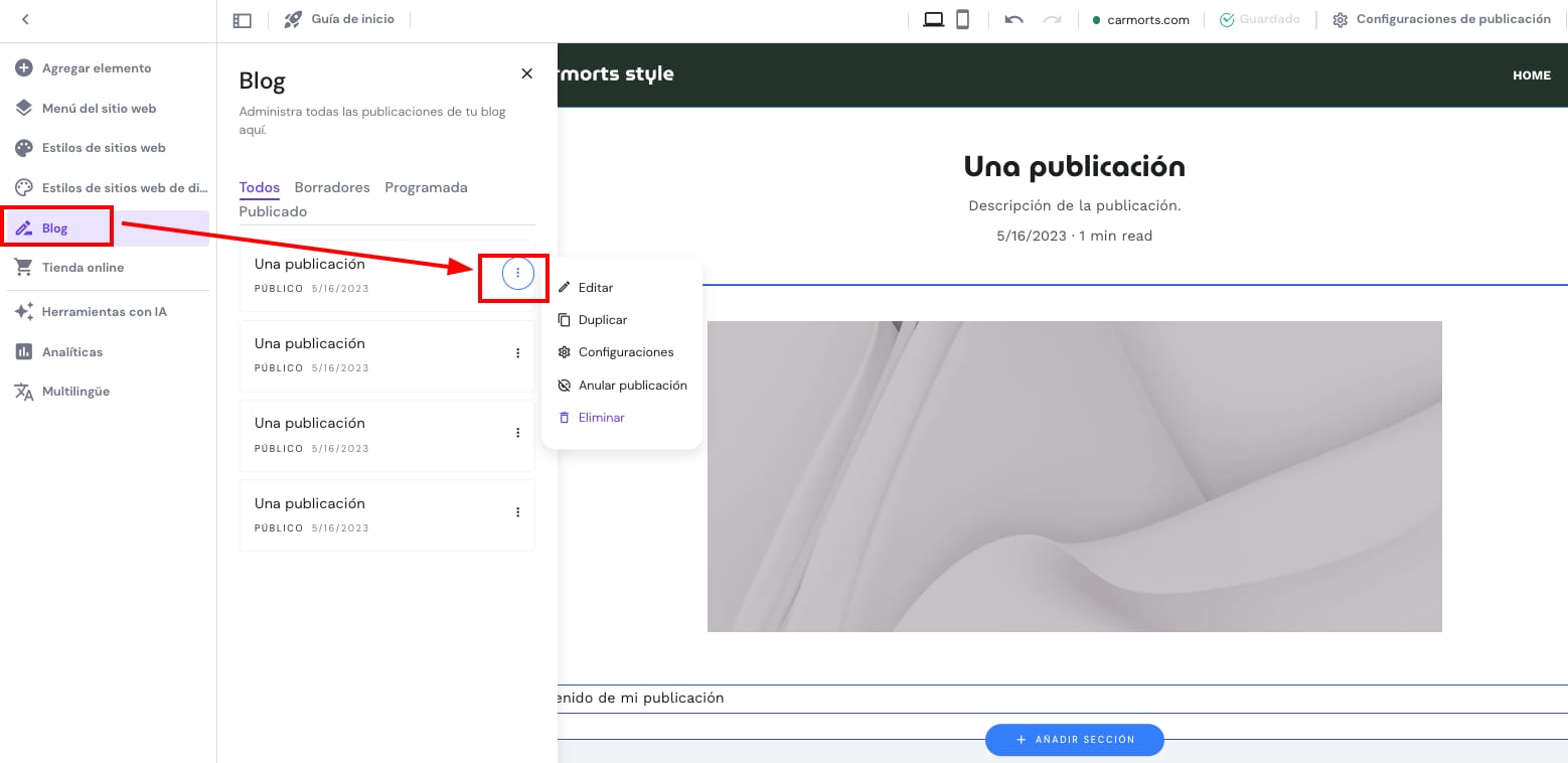 Dentro del editor, abre el panel de administración del blog a la izquierda y busca una publicación que quieras programar. Haz clic en el botón de puntos suspensivos ⋮ junto a tu título: