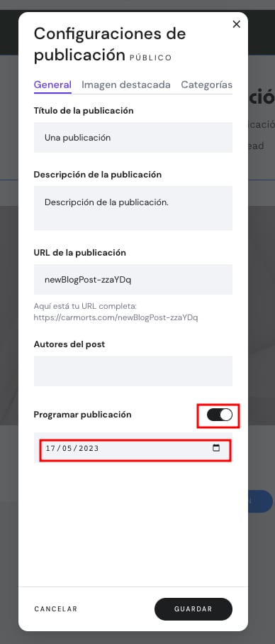 En la pestaña General, desplázate un poco hacia abajo y cambia el botón Programar publicación. Luego, selecciona la fecha preferida:
