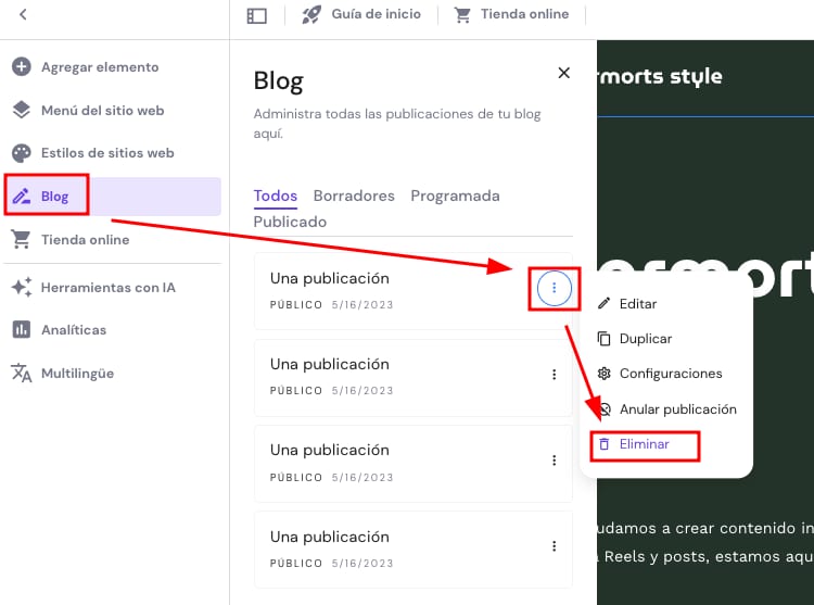 Dentro del editor, abre el panel de administración del blog a la izquierda y busca una publicación que quieras eliminar. Haz clic en el botón de puntos suspensivos ⋮ junto a su título y haga clic en Eliminar: