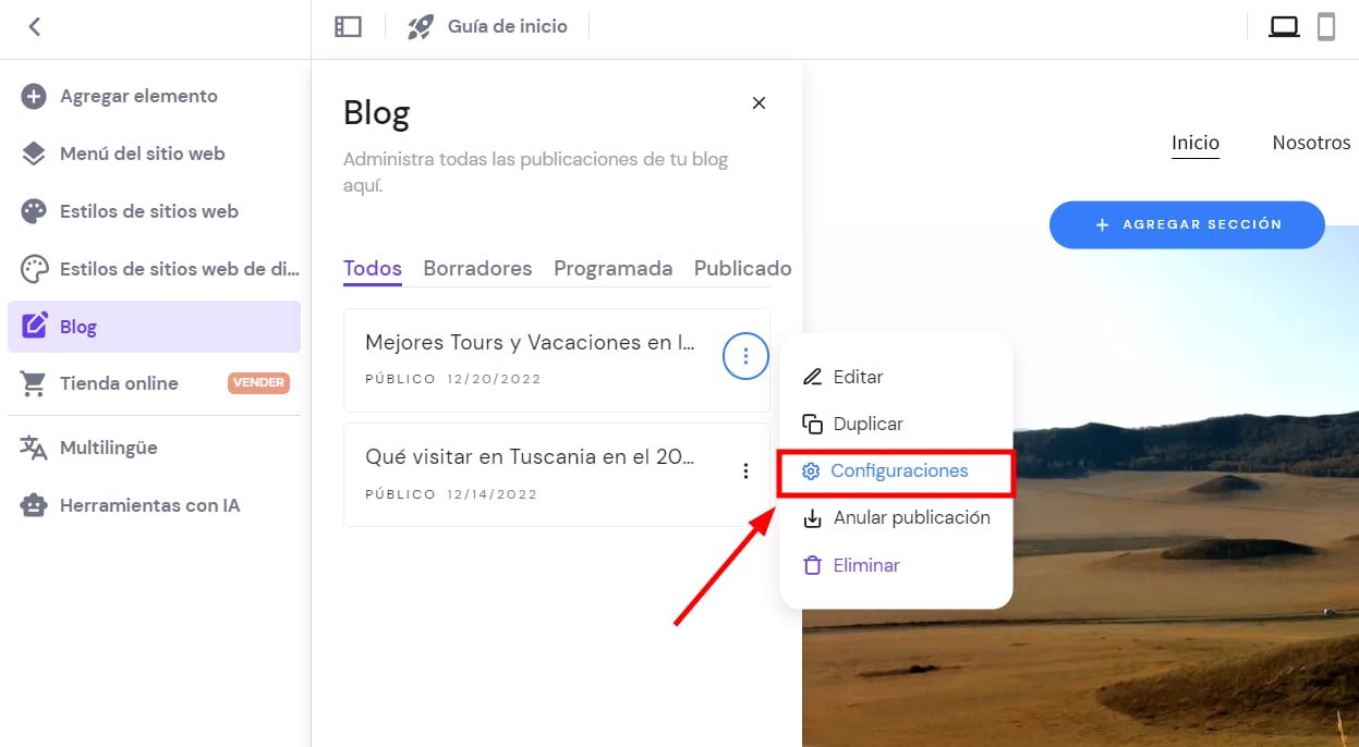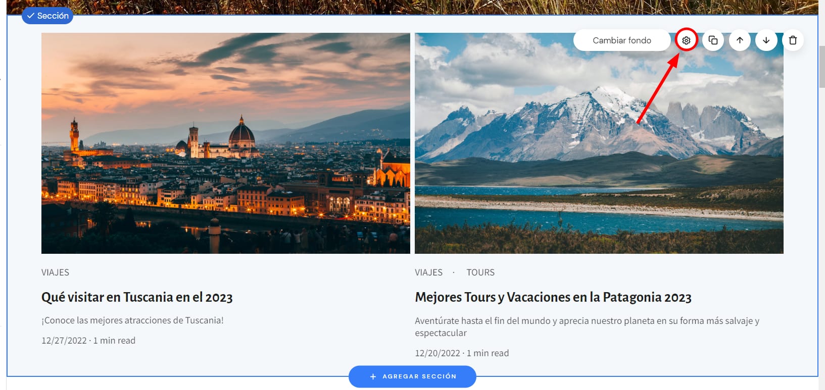 2. Haz clic en una sección del blog y abre su configuración: