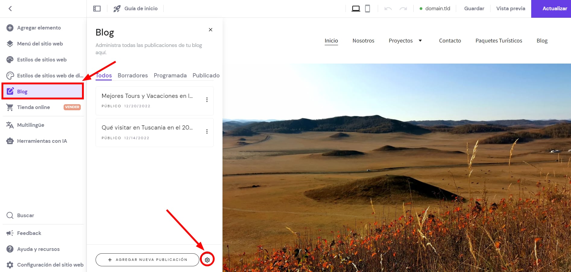 1. En el editor, expande el panel de administración del blog a la izquierda y haz clic en la rueda de configuración en la parte inferior:
