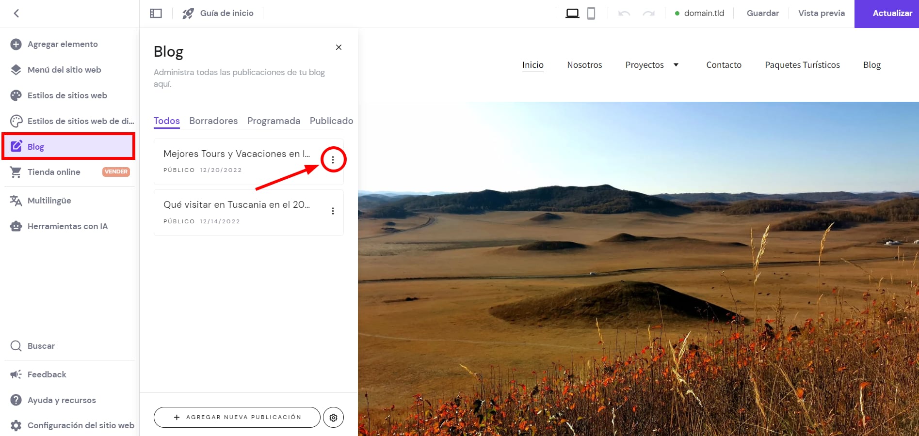 1. Dentro del editor, abra el panel de administración del blog a la izquierda y busca una publicación en la que desees asignar a una categoría en particular. Haz clic en el botón de puntos suspensivos ⋮ cerca del título de la publicación del blog: